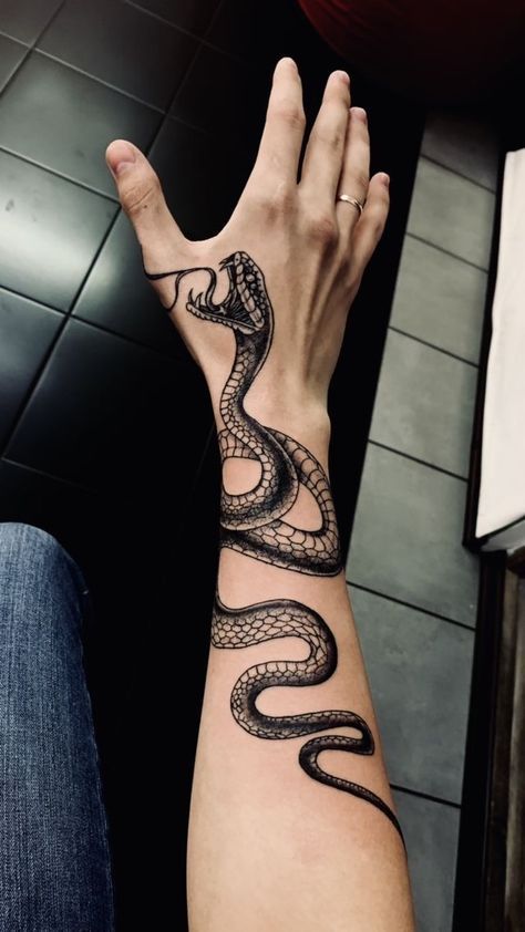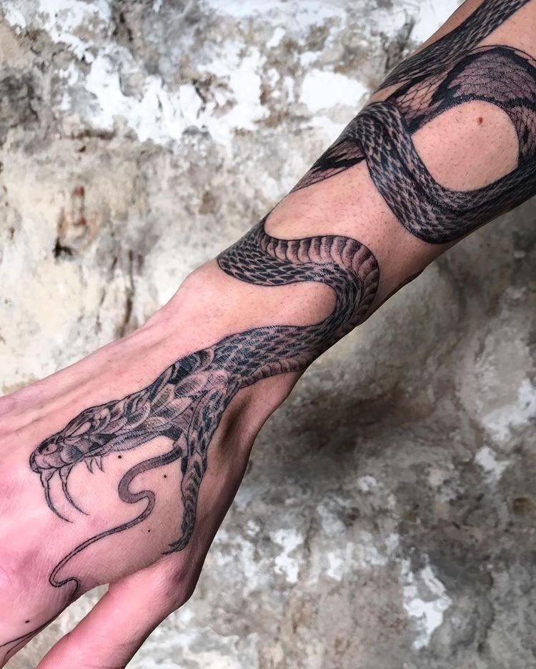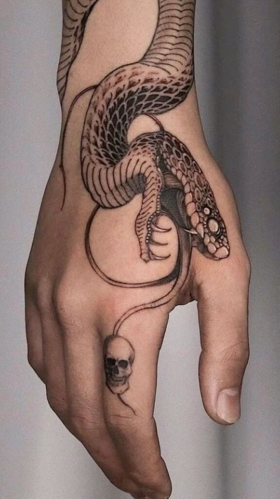 If you’re bold enough to ink your hand, this one’s for you. The snake hand tattoo is striking and always visible — a real statement of confidence.
