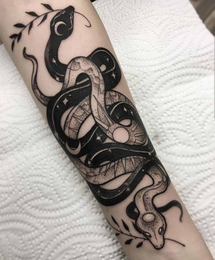 Two snakes facing each other or intertwined? That’s duality and balance — yin and yang style. It represents opposing forces working together, which honestly feels like adulthood in tattoo form.