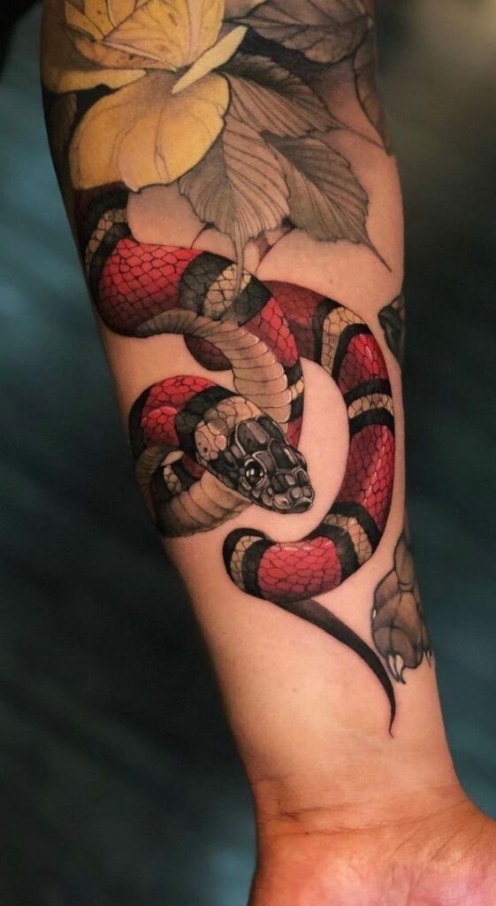 This one’s especially popular as a snake tattoo for women. Flowers add softness, while the snake brings strength — the perfect balance of beauty and danger.