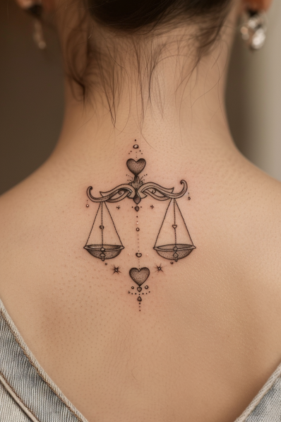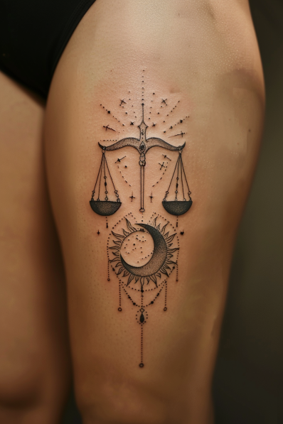 Since Libra seeks balance, pairing the sun and moon with the scales creates a powerful visual. This design symbolizes harmony between opposites—light and dark, masculine and feminine, strength and softness. Such tattoos often look stunning across the back, thigh, or upper arm.
