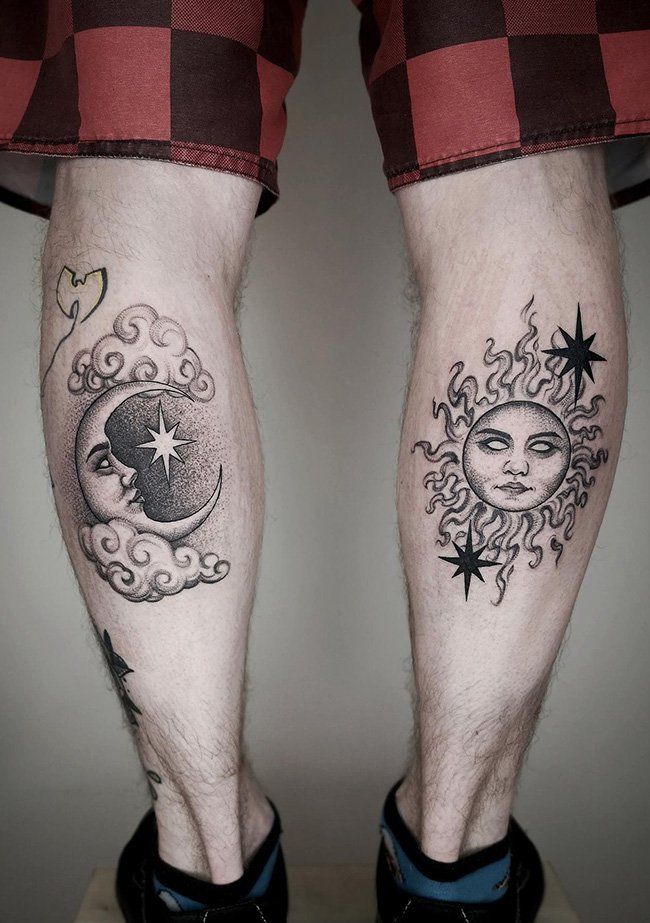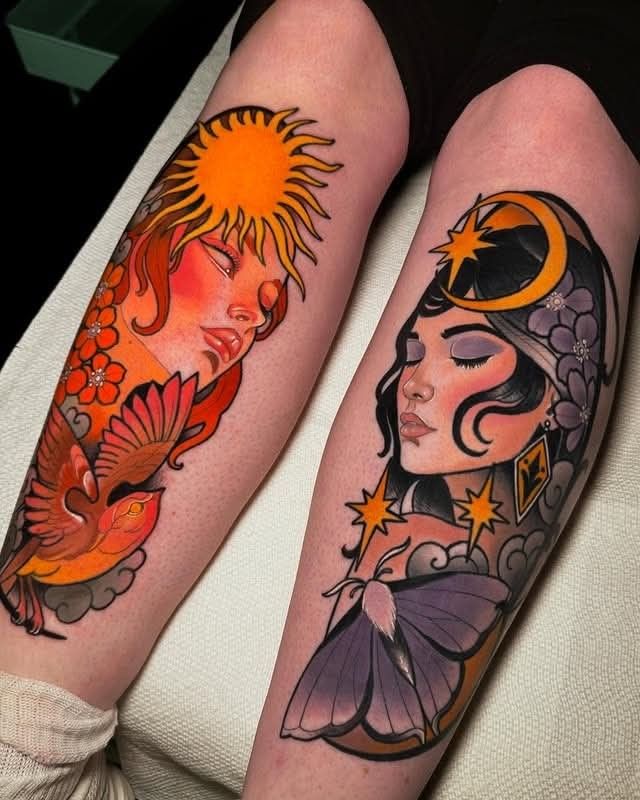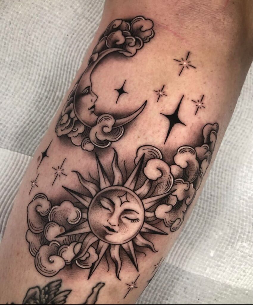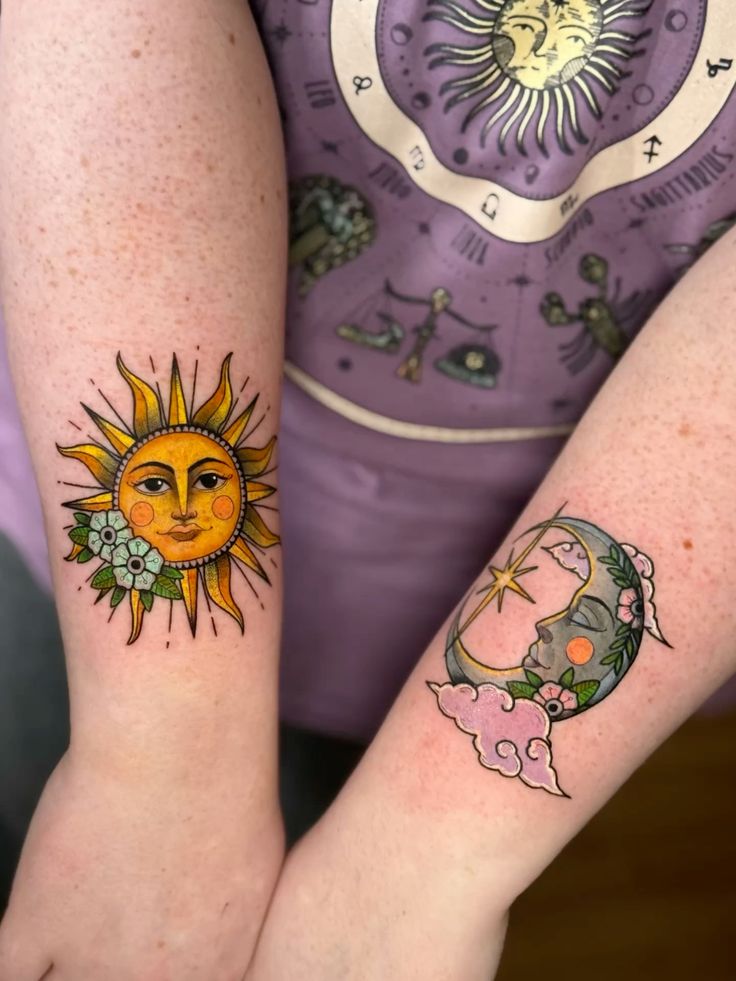 Arm tattoos give sun and moon designs room to breathe. You can stretch the sun along the bicep and let the moon curve naturally around the forearm.