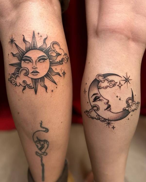Adding faces to the sun and moon instantly makes the tattoo feel alive. I’ve seen designs where the sun smiles softly while the moon looks calm and mysterious. That contrast? Chef’s kiss.