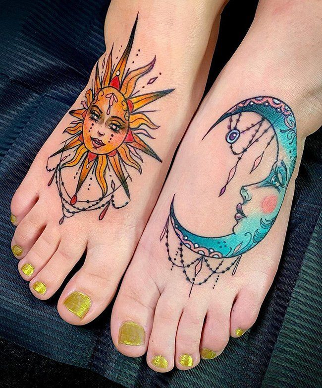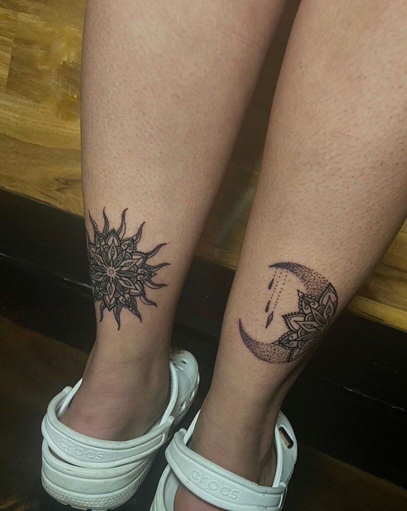 I love this one personally. Sun and moon tattoo matching best friends ankle designs feel balanced and graceful.