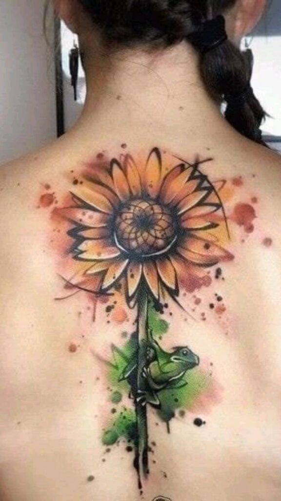 A watercolor sunflower tattoo blends the beauty of the flower with the fluidity of watercolor ink. Soft brushstroke effects and splashes of color create an artistic design that feels unique and dynamic. This style works well for free spirits who want their tattoo to look like a living painting.
