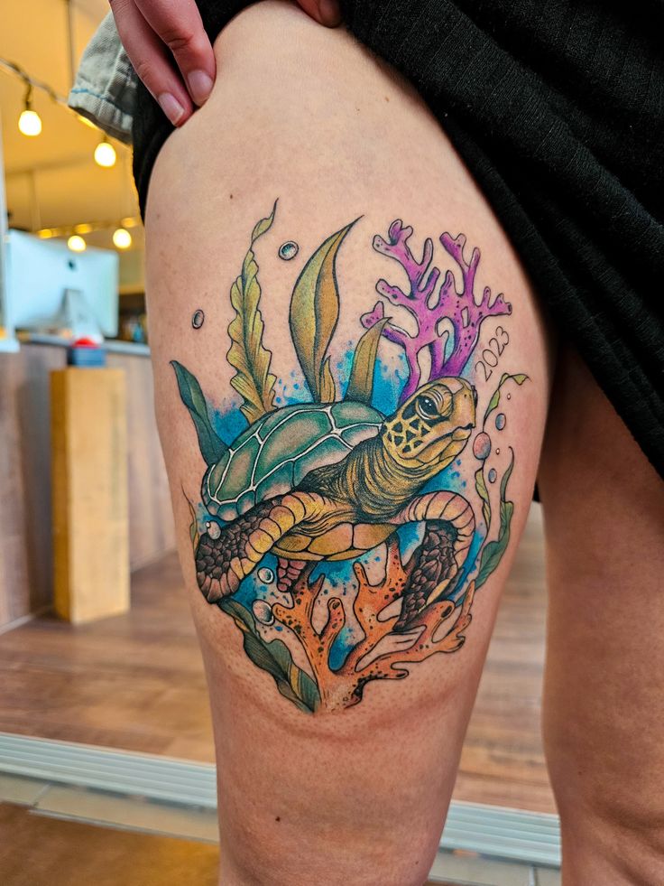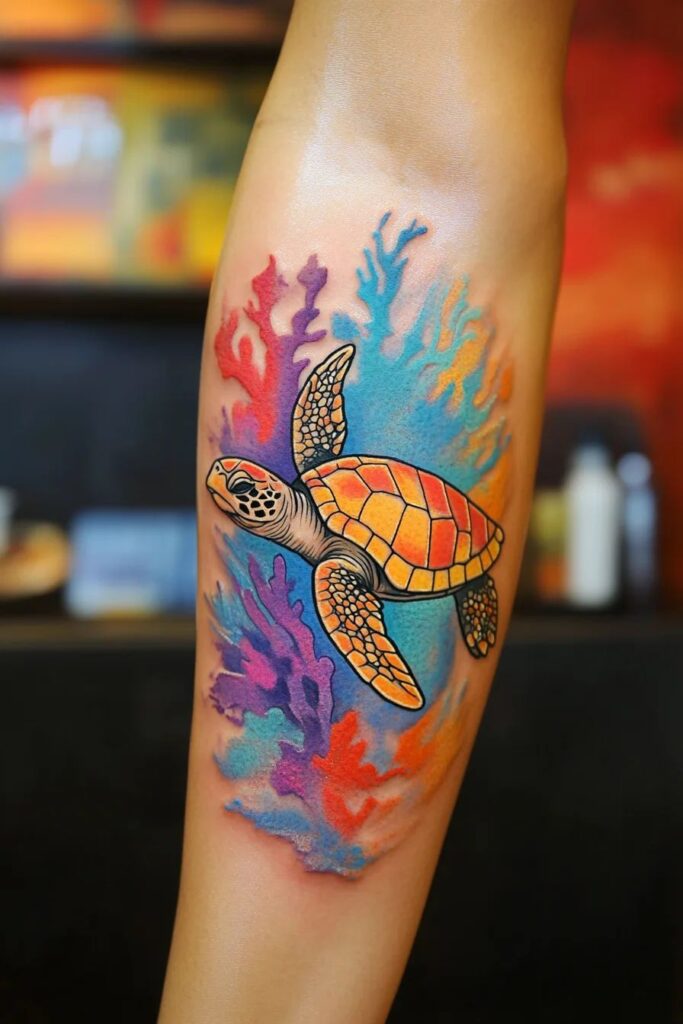 Sea turtle tattoos feel peaceful but powerful. They remind me that strength doesn’t need chaos to exist. Sometimes slow and steady really does win the race—shocking, I know.