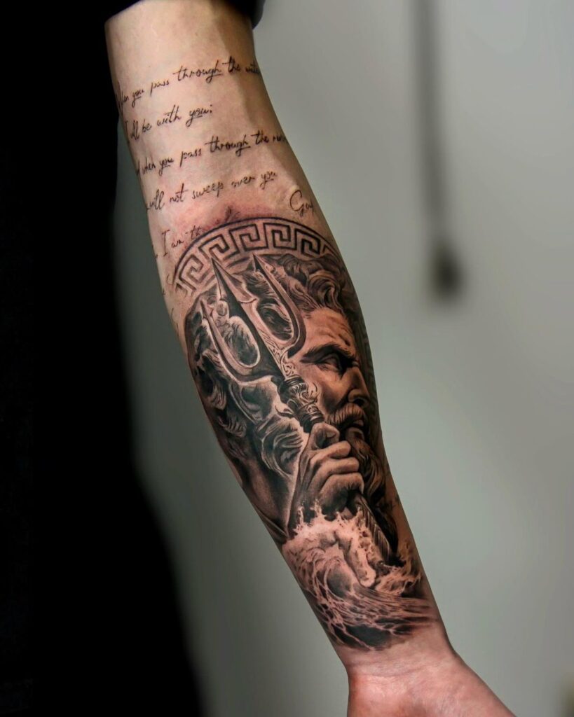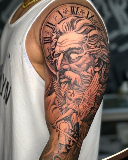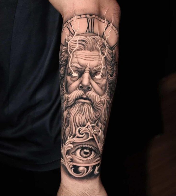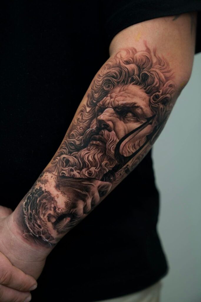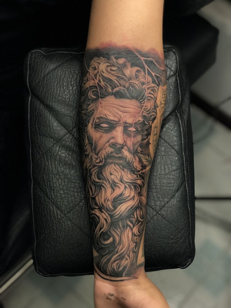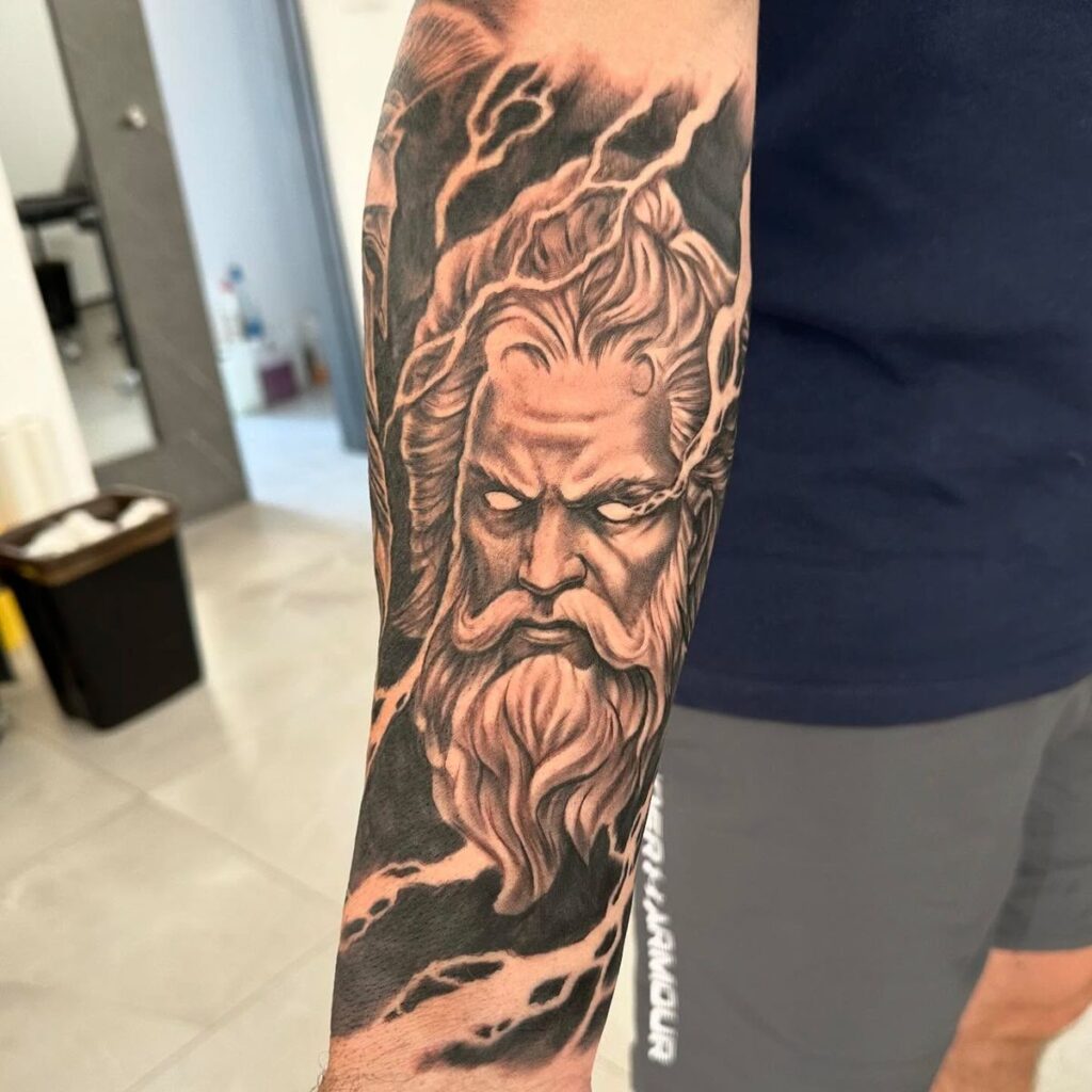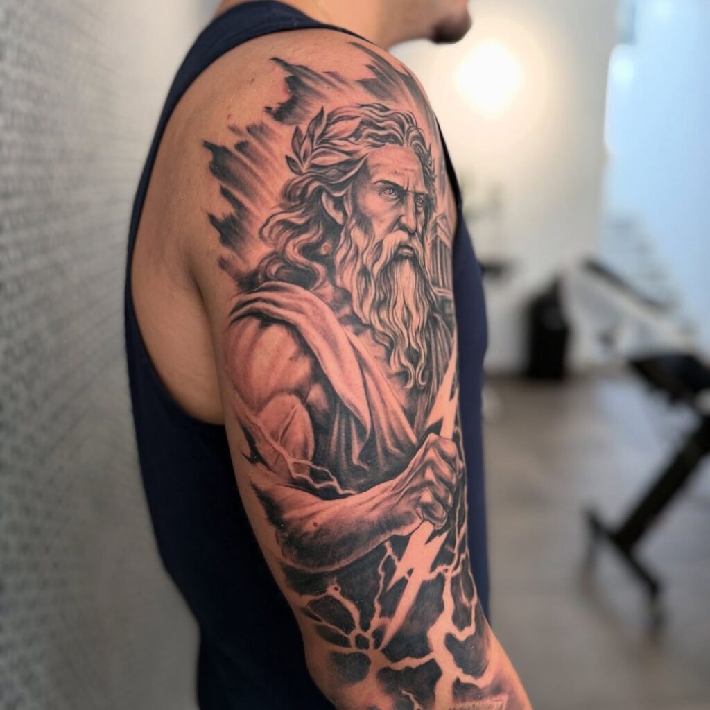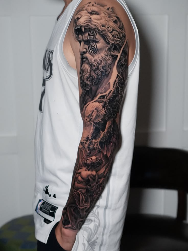 10. Zeus Sleeve Tattoo (Full Mythological Story)